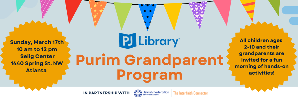 PJ Library Grandparents Program Sunday, March 17, 2024 10:00 AM 12:00 PM Google Calendar ICS Take the morning off and send your kids with their grandparents to a Purim celebration at The Federation on Sunday March 17th at 10AM! Geared towards ages 2-10, and for grandparents from any congregation. RSVP here.