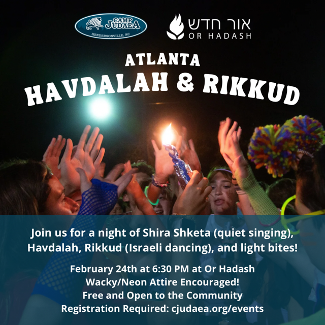 Join us for a night in partnership with Camp Judaea of CJ-style Shira Shketa (quiet singing), Havdalah, Rikkud (dancing), and light bites! RSVP here.