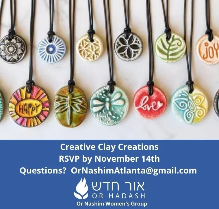 Join Sharon Clark for an evening of gift-making. Learn ways to sculpt, texturize and paint polymer clay, to create pendants, mezuzot and other small functional pieces of art. Polymer clay (also known as Sculpey or Fimo clay) is easy to work with and super versatile. Or Nashim members/FREE, non-members/$10. Please RSVP by November 14th. Sharon Clark was the art teacher at the Epstein School for over 18 years. Shortly afterwards she opened Purple Hippo Art Studio in Dunwoody.