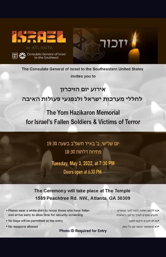 On behalf of the Consulate General of Israel to the Southeast, we would like to extend a warm invitation to you to attend the Yom Hazikaron Memorial Ceremony for Israel’s Fallen Soldiers and Victims of Terror. The ceremony will take place on Tuesday, May 3, 2022 (2 Iyar 5782) at 7:30 pm at The Temple, 1589 Peachtree St. NE, Atlanta, GA, 30309 (Doors will open at 6:30 pm; more information is located in the flyer below).