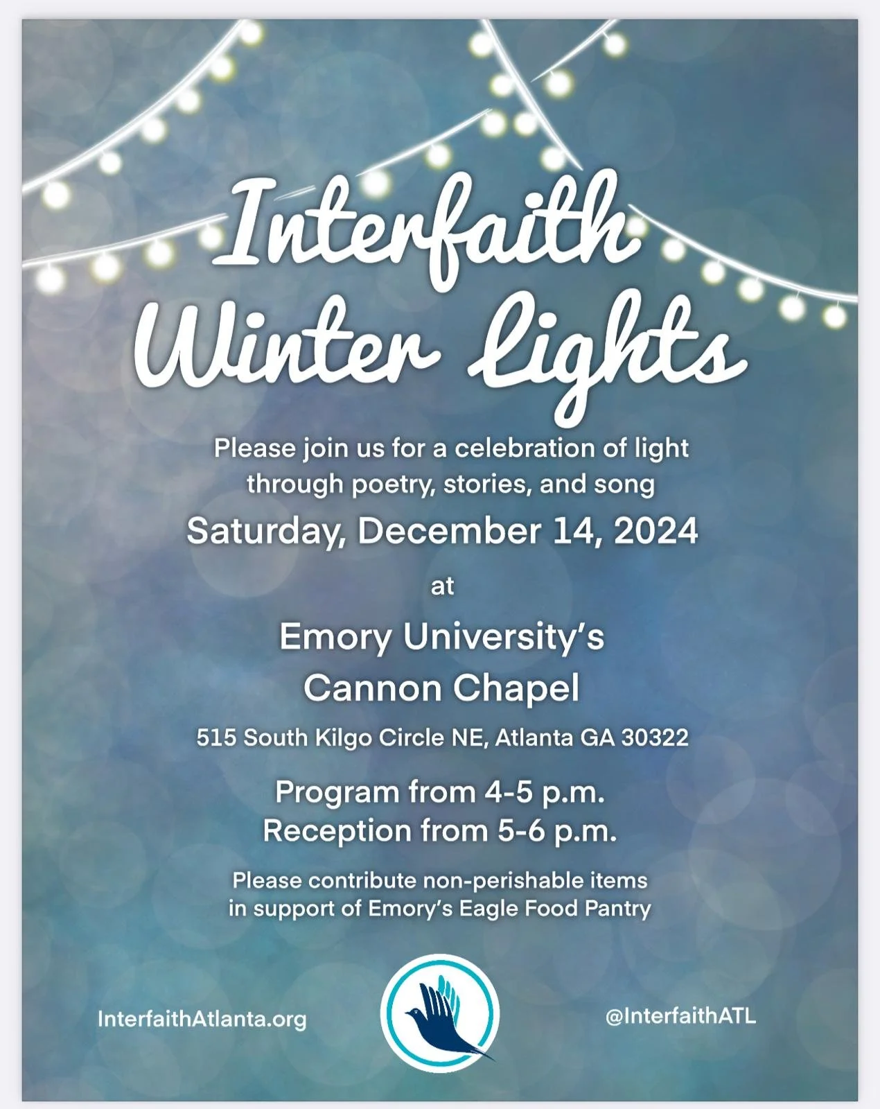 Please join us at Emory University’s Cannon Chapel for a celebration of light through poetry, stories and song. For additional details, please click here.