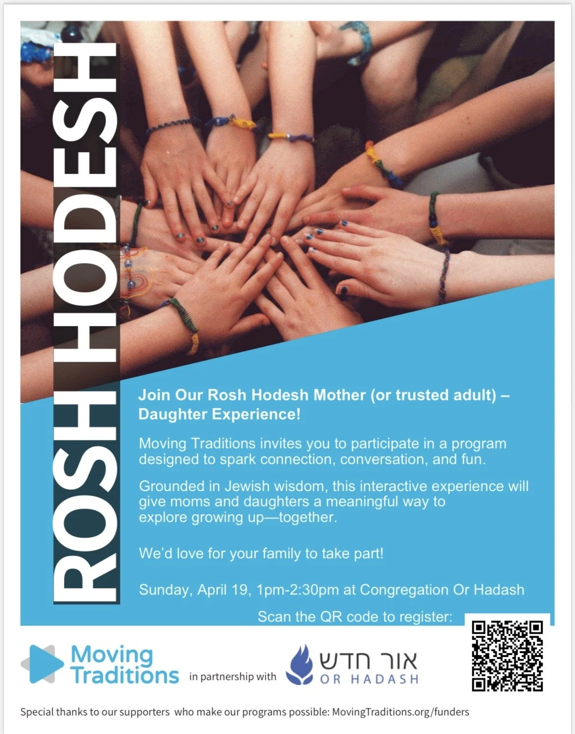 Moving Traditions invites 4th-8th grade mother/daughter pairs to participate in a program designed to spark connection, conversation, and fun. Grounded in Jewish wisdom, this interactive experience will give moms and daughters a meaningful way to explore growing up -- together. We'd love for your family to take part!