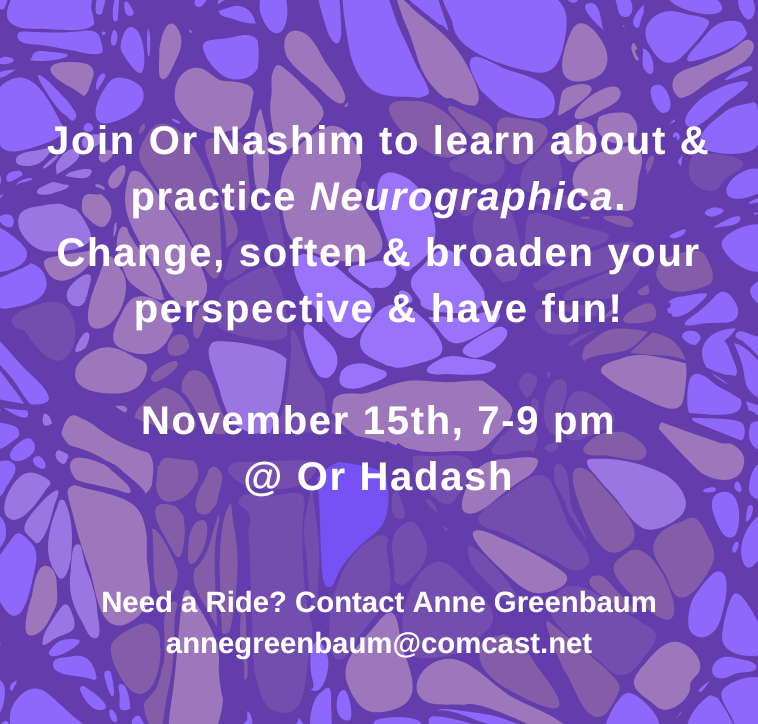 Looking for a creative, transformative break in your week? Join Or Nashim for a very special workshop led by artist Barbara Flexner. Change, soften, and broaden your perspective by learning about and practicing Neurographica. This artistic medium offers the potential to change your worldview! No experience or materials are necessary; everything will be provided. RSVP here.