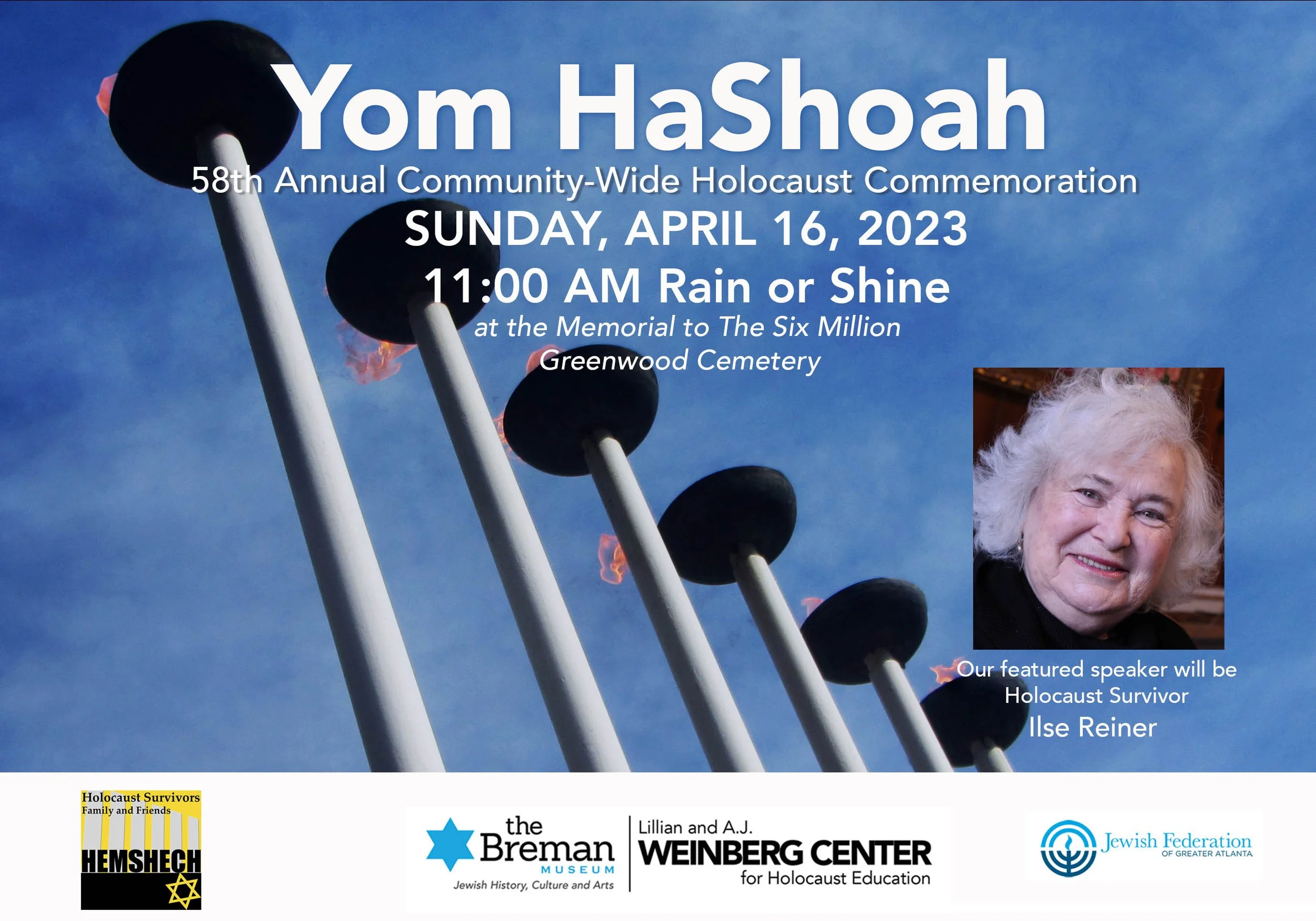 The 58 th annual Yom HaShoah Commemoration will be held at the Memorial to the Six Million, located at Greenwood Cemetery (1173 Cascade Circle SW, Atlanta, GA 30311).